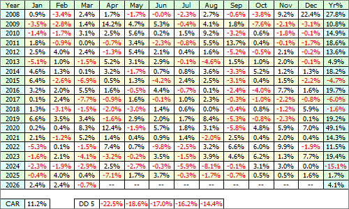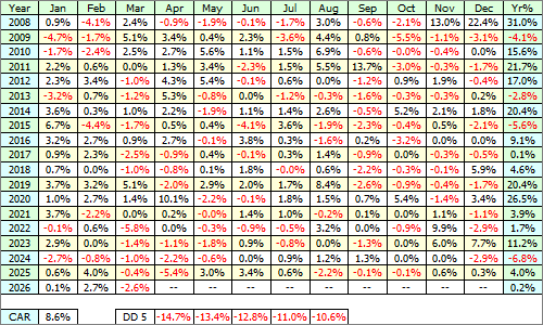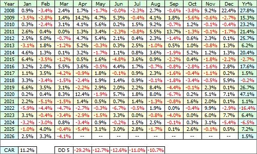 Testing period is from January 1, 2008 to March 31, 2026 and metrics are updated after the end of each quarter.